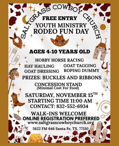 Click this Link to Register your Kids for the Events: https://saltgrass-cowboy-church.missionpillars.com/events/655b43b4-2bba-44a6-ab58-6359a4f9665c/share